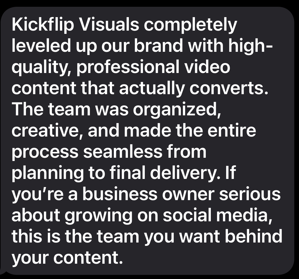 We handle everything from strategy to execution--scripting, shooting, editing, and optimizing your videos for maximum impact. Whether you need high converting ad creatives, brand story telling, or content that drives inbound leads, we make sure every video is built to generate revenue, not just views.
